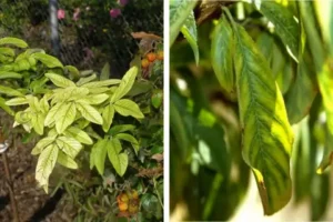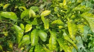 - Cây có múi (cam, chanh, bưởi): Xuất hiện lá úa vàng không đều giữa các gân, lá non ngắn và hẹp, đầu cành bị khô và cây dần suy yếu.